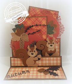 Snij bruin cardstock van 15 x 30 cm en ril en vouw deze deze op 7,5  bergvouw- 15 dalvouw- 19 dalvouw - 22 bergvouw en 25 cm dalvouw. Plak op de voorkanten het designpapier uit de PK9138 Canadian Fall. Snij van bruin cardstock 2 rechthoeken van 14 x 8,5 cm en plak hierop design papier van 13,5 x 8 cm. Stans uit steenrood 2 x de Leaf Doily. Stans de leaves uit groen, en verschillende restjes bruin. Stans uit verschillende kleuren bruin Eline's Squirrels, de Ahorn with leaf en de Pine corns van Tiny.